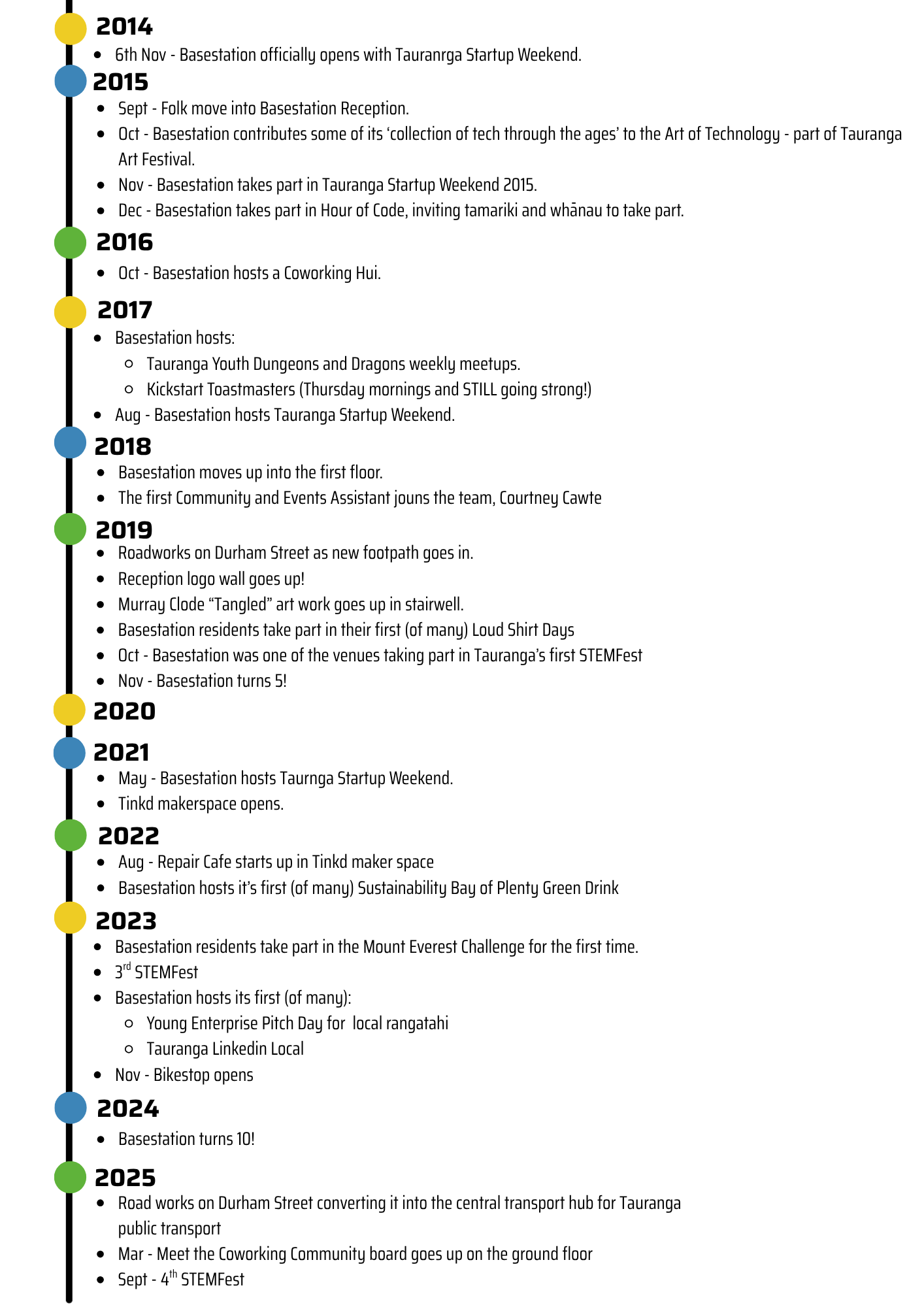 Over the past eleven years, we’ve seen incredible growth, welcomed countless residents, hosted inspiring events, and watched Tauranga’s startup and creative ecosystems flourish. Each milestone on this timeline represents not just what we’ve built, but the people, ideas, and collaborations that make Basestation what it is.